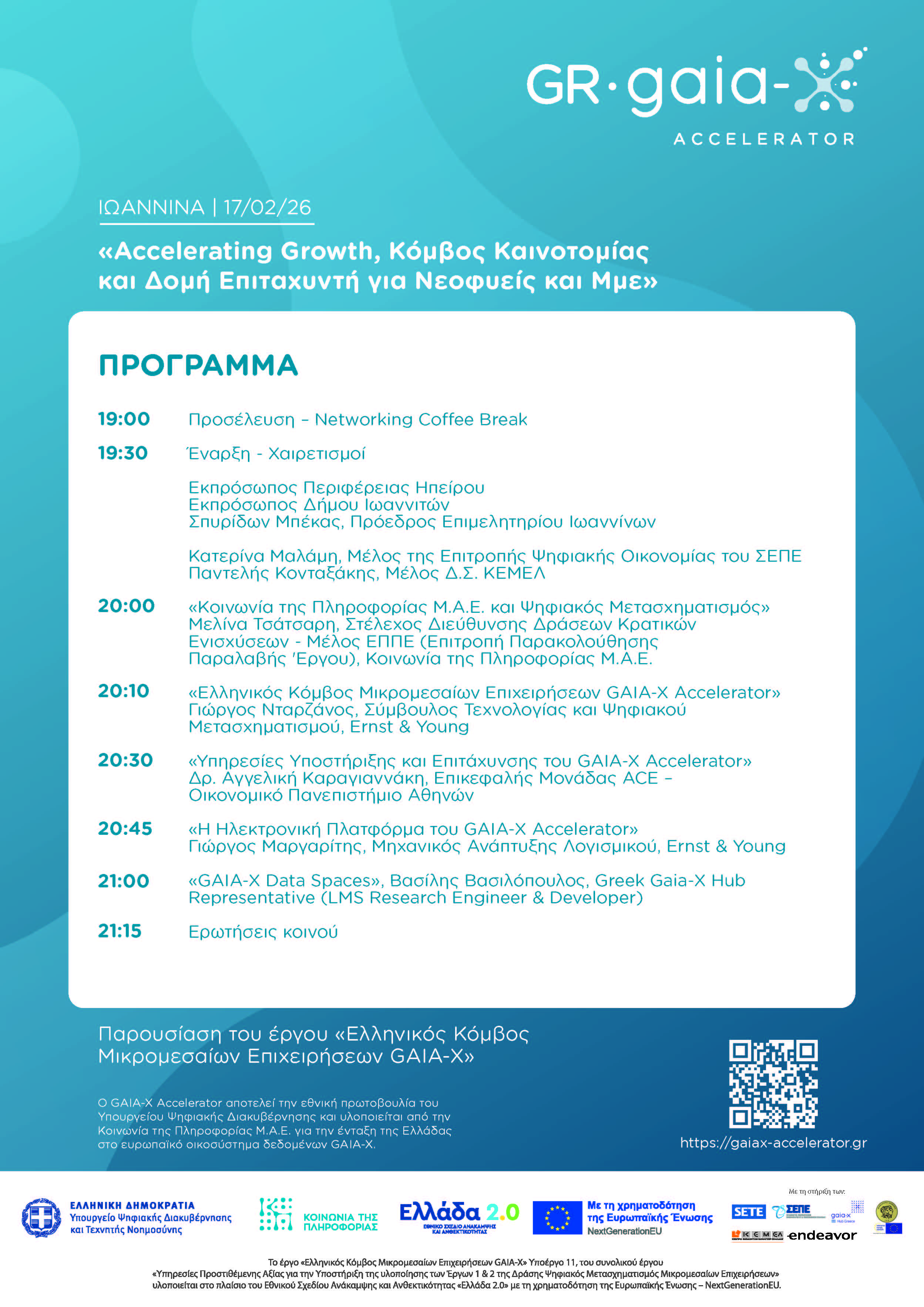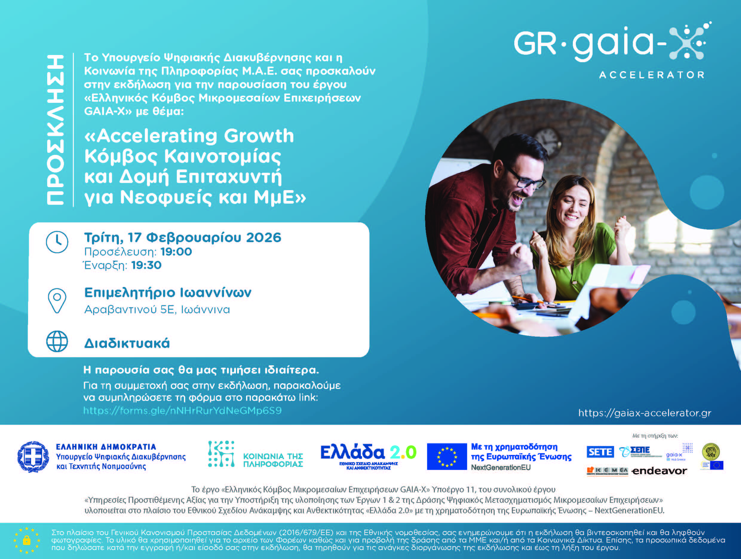 ΠΡΟΣΚΛΗΣΗ στην Εκδήλωση για την Παρουσίαση του έργου «Ελληνικός Κόμβος Μικρομεσαίων Επιχειρήσεων GAIA-X» Τρίτη, 17 Φεβρουαρίου 2026 στην Αίθουσα Εκδηλώσεων του Επιμελητηρίου Ιωαννίνων. (Αραβαντινού 5ε)
